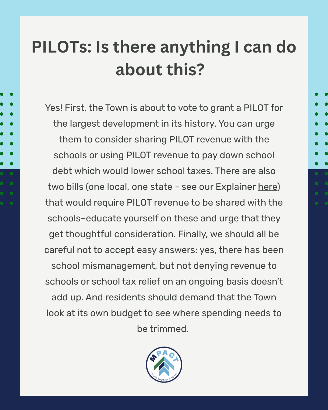 It also makes several recommendations. First, for residents to educate themselves on the important legislative actions being considered: the Lackawanna Plaza redevelopment, a separate town resolution, and a proposed State law that would require revenue-sharing. MPACT also calls on the Town to publicize its rationale in support or against PILOT revenue-sharing. Finally, MPACT recommends that the Town Council conduct a careful assessment of the impact of PILOTs in Montclair, and what form they should take if continued.